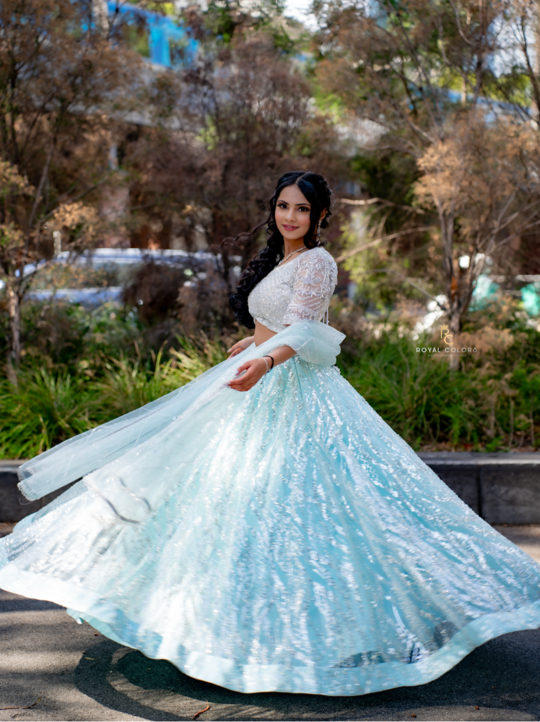 This enchanting lengha set blends serenity and sophistication in hues of ice blue and white. The net blouse in pure white is paired with a flowy ice blue net lengha skirt, creating a soft, graceful silhouette. A delicate white net dupatta, finely detailed with hand embroidery, completes the ensemble with understated charm. Fully handcrafted with precision and artistry, this set exudes timeless elegance, perfect for making a subtle yet striking statement.