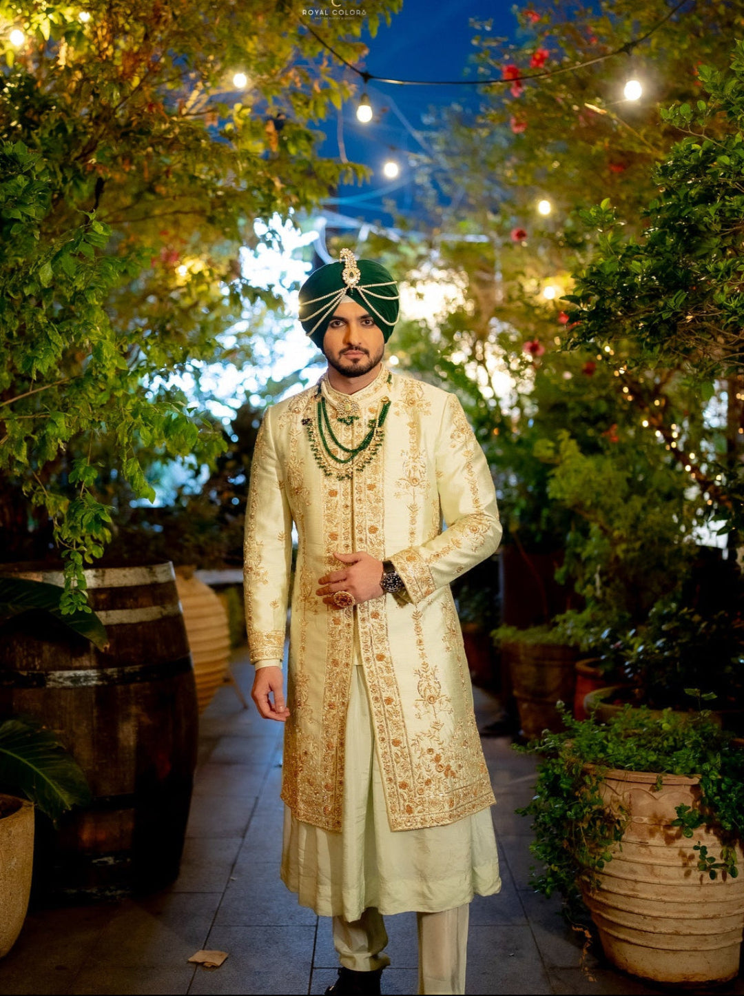 This lime green sherwani is crafted from pure silk and enhanced with 100% pure hand embroidery, reflecting the perfect blend of traditional craftsmanship and modern elegance. The structured silhouette exudes a commanding presence, while the tabbi silk palla, intricately hand-embroidered, adds a touch of refined grandeur — ideal for grooms or distinguished guests.